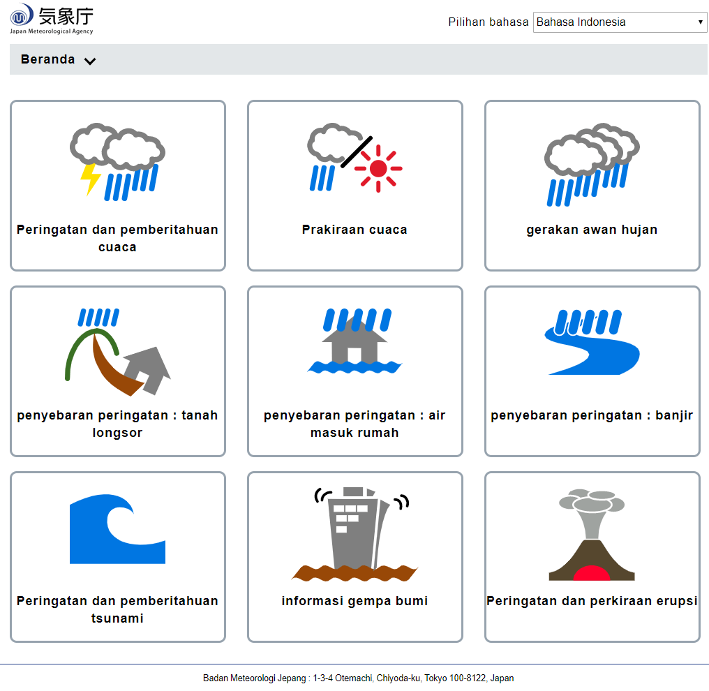 Badan meteorologi jepang, dalam rangka agar warga asing yang datang dan tinggal di jepang dapat menjalani aktivitas dengan tenang dan nyaman, maka mulai 30 September 2019, situs badan meteorologi jepang telah dihadirkan dalam 11 bahasa, bahasa Indonesia termasuk salah satunya.